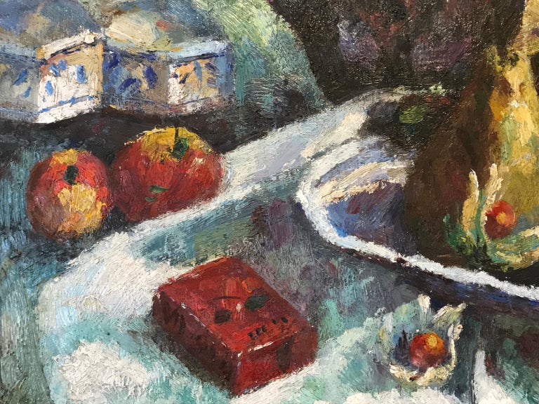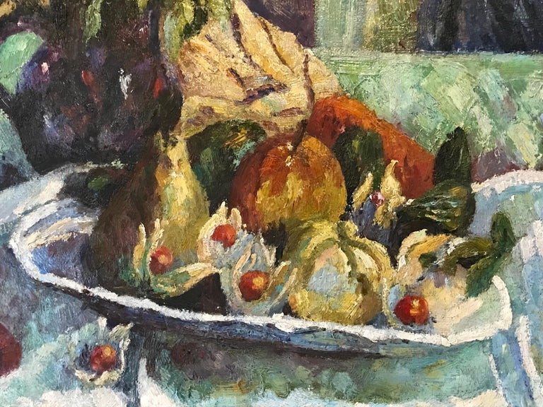 A prominent member of the Fauve circle, Henri Charles Manguin was renowned for his radiant use of color and vibrant sunlit Mediterranean landscapes, intimate interiors, or, as with the present work, still lifes. A friend and contemporary of Henri Matisse and Charles Camoin, he trained under Gustave Moreau at the École des Beaux-Arts in Paris, where he absorbed the expressive potential of color that would be the hallmark of his paintings. In the present work, a richly hued bouquet fills a deep violet vase, while a platter of pears, figs, gooseberries and other fruit, rests on a white ceramic platter touched with light blue. Manguin exhibited works with this same refinement of compositional structure and expressive brushwork at the Salon des Indépendants and the Salon d’Automne, which established him as one of the boldest voices of early modern French painting.