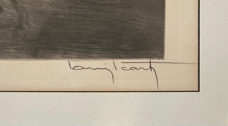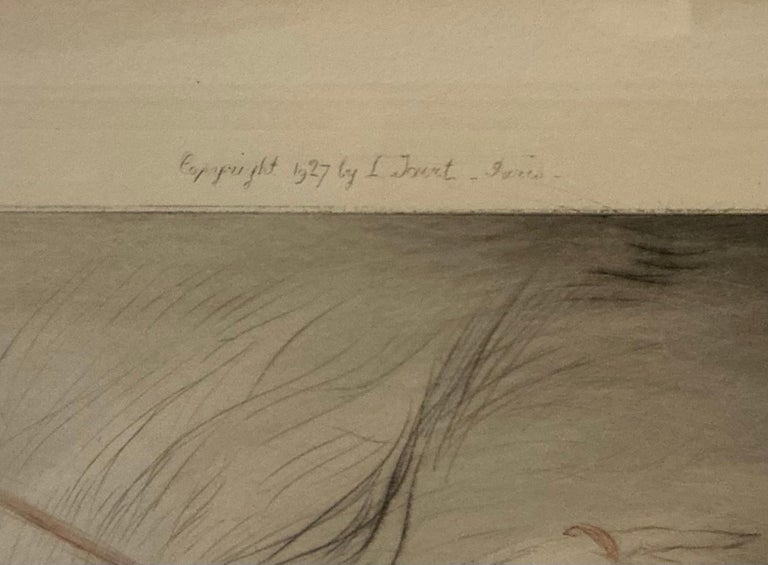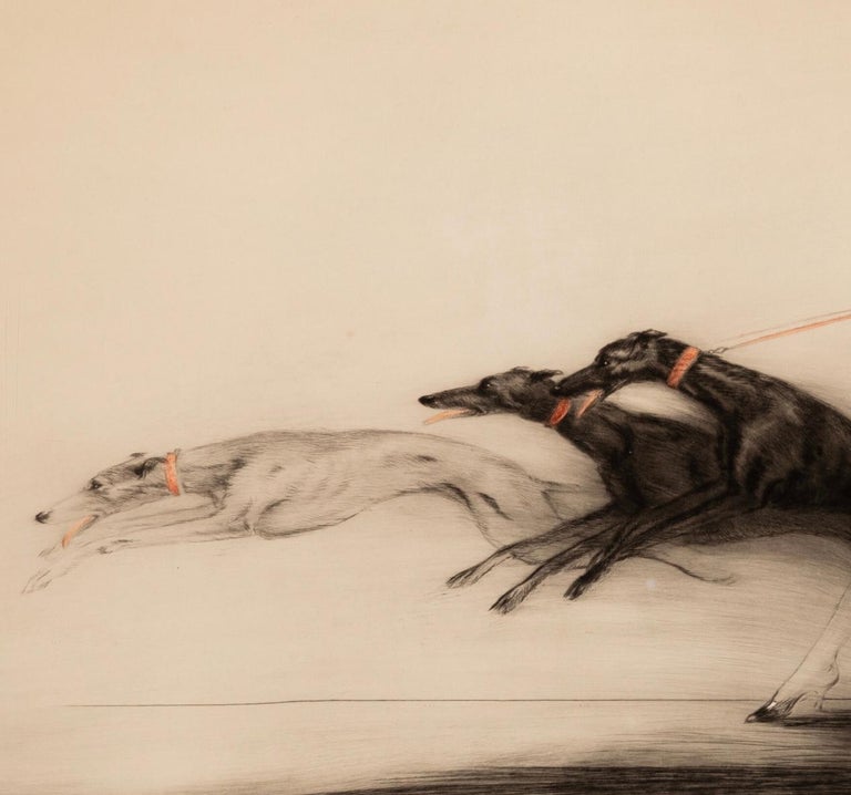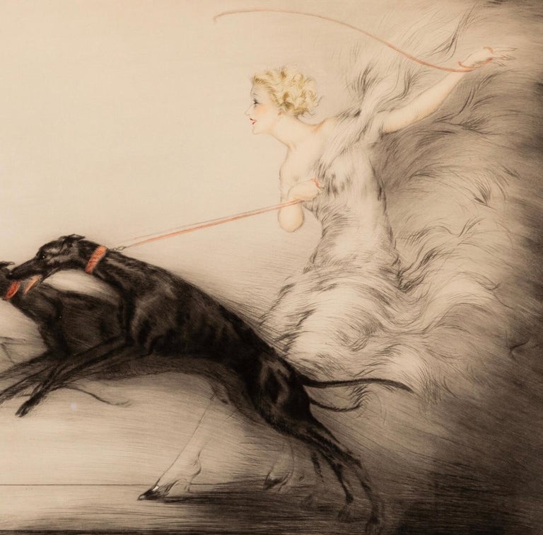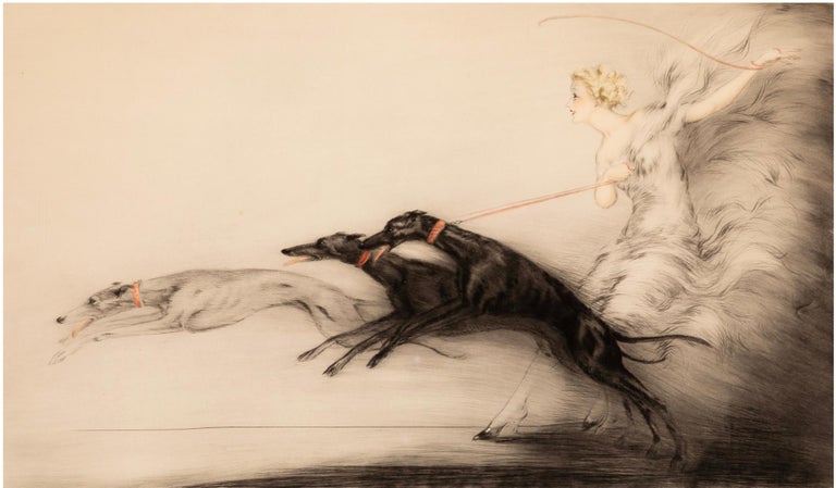 in colours with hand colour, with pencil and watercolour drawing of dogs in bottom margin, signed in pencil Louis Icart, Gravure Garantie Originale circa 1927, a pencil charcoal and pastel on light paper
